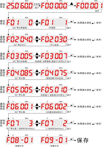 降温型:当F01设置0时为降温型,当环境湿度高于湿度****值(湿度设定值)期间除湿装置会自动开启除湿;当环境湿度低于湿度最低值(湿度设定值减去湿度回差值)停止除湿。当环境温度高于设定温度最高值(温度设定值),风扇散热开始启动,当温度低于设定温度值(温度设定值减去温度回差值)降温风扇停止工作。