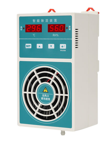 智能型除湿装置是采用半导体制冷除湿方式,主动将密闭空间的潮湿空气在风扇的作用下吸入除湿风道,空气中的水汽经过半导体制冷机构后冷凝成水,再通过导水管排除柜体,可以达到很好的除湿效果。